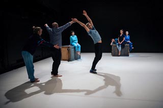 Situacije se grade, igra raste, sve je više izvođača istovremeno na sceni, ne nužno u istom kolu nego u grupicama, brže su izmjene i lagano kreće i verbalni folkor. Čini mi se da ga započinje Livio (koji već i ranije asocira na svojevrsnog kolovođu. Sa svojom veličanstvenom vertikalom i dizanjem ruke te davanjem znakova) i to uzvikom „Ajmo!" koji je, izveden snažno i kao bič u nekakvom nesrazmjeru sa samom njegovom pojavom a i načinom kretanja koja odiše urbanom intelektualnom profinjenošću, ispunjen komičnim odmakom. Svatko nalazi svoje naredbe, dinamika raste, komično je a opet... vidimo grupu ljudi u kojoj svatko drži svoju poziciju, svoj pokret koji repetira, gledajući u publiku, stvara se slika i onda mrak.